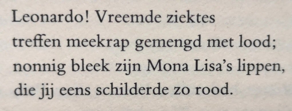 Meekrap gebruikt als verf en dat gemengd met lood bleek geen goede combinatie! De rode lippen van het wereldberoemde portret zijn er door verschoten, vervaagd, verflauwd, verslapt. Nonnig, als de bleke lippen van nonnen, zo noemt Nabokov het in zijn fantasie. We kennen Mona Lisa niet anders dan met bleke lippen. Net als de rest van het doek; het heeft weinig kleur meer, vergeeld door de laag vernis en de blootstelling aan licht. Hoe het origineel er uit zag weten we niet.