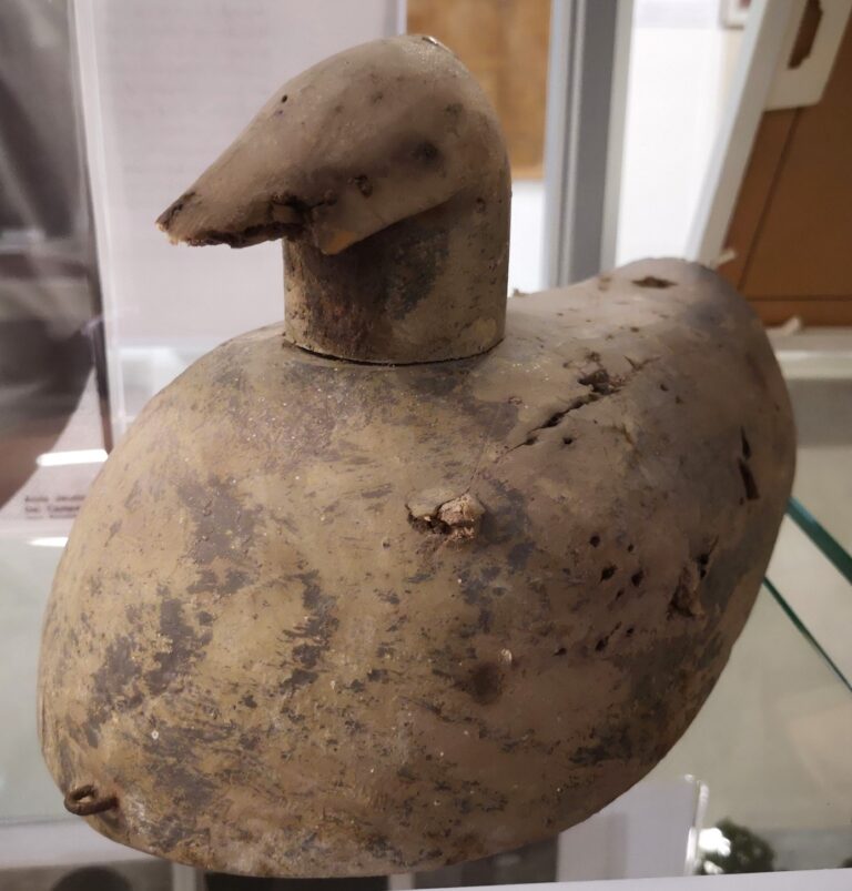 vroeger wilde eenden werden gevangen met een lokeend? Dat gebeurde onder meer in de eendenkooi in Anna Jacobapolder op Sint Philipsland. Een plas met water in een bos met uit vier windrichtingen een sloot die naar de vijver lopen, de zogeheten vangpijp waar de eenden in zwemmen op zoek naar een rustige plek. De eenden werden gevangenen voor consumptie. Dat is niet meer zo. Nu worden ze gevangen om geringd te worden en om bloedmonsters af te nemen voor wetenschappelijk onderzoek naar vogelziektes. Deze lokeend heeft zijn werk gedaan en rust uit in de vitrine van de tentoonstelling Dijken, polders en vloeden. Kom ok es kieke, dan bluuf je kieke…